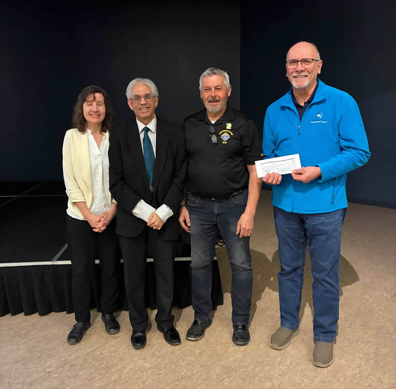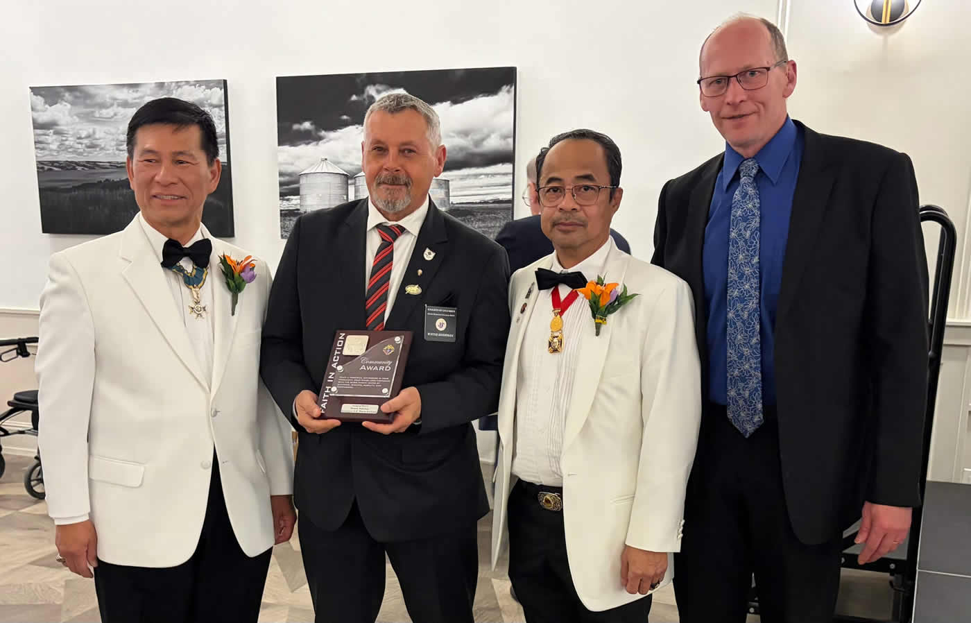 "Marv Friesen, MLA for Saskatoon Riverdale, presents KofC Council 8215 with the Premier's Service Club Award for our service towards the Celebrity dinner that has been raising money for the Jim Pattison Children's Hospital. Garry Maier, Chair of the Celebrity Dinner Committee and Grand Knight Jim McDonald. Marv also brought greetings from the Premier to council.